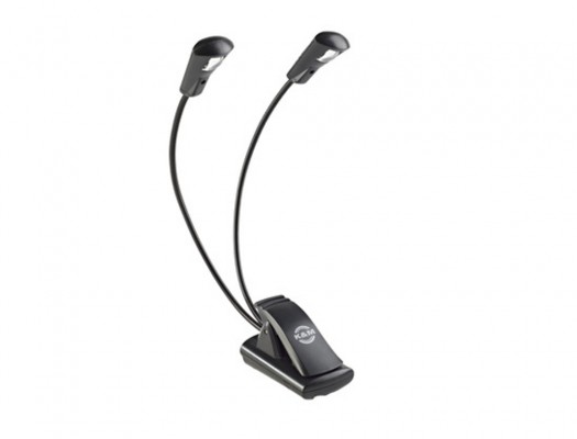 Compact and versatile dual-headed light with 2 flexible goosenecks and with one durable LED on each head. The 2 LEDs can be switched on individually and are rated for 100,000 hours. The practical and extra-wide clip (up to 25 mm) attaches to music desks, table tops etc. It can also be used as a standing light. The goosenecks are easy and compact to fold. Includes 3 batteries (1.5 V AAA) with a battery life of up to 20 hours.