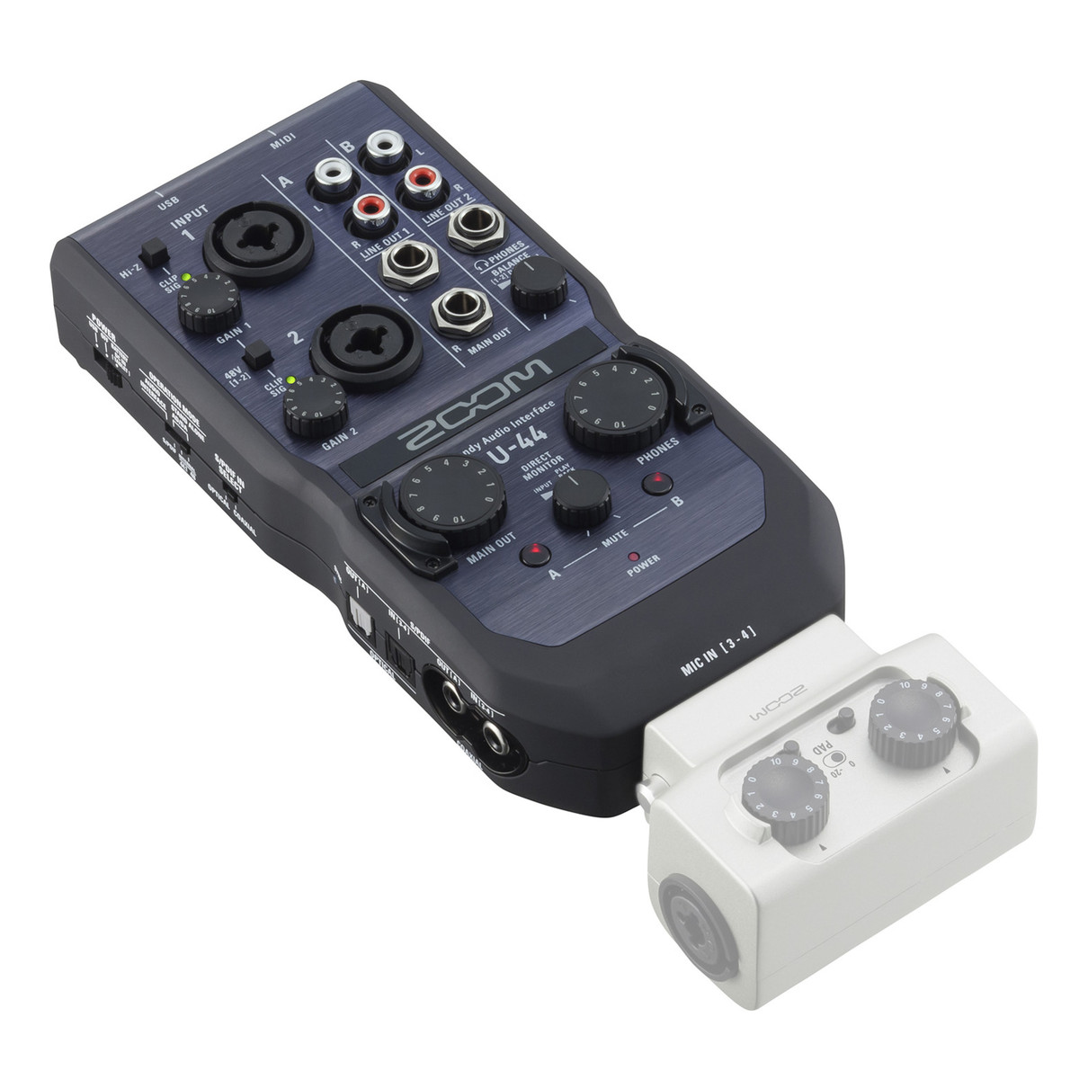 The U-44 offers the same high-quality, low-noise mic preamps as our acclaimed H5 and H6 Handy Recorders, plus compatibility with Zoom’s Interchangeable Input Capsules for incredible possibilities. Use the U-44 with your PC, Mac, or iPhone/iPad via USB—or as a standalone AD/DA converter and mic preamp. No other audio interface provides this much versatility, value, and performance.